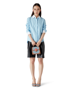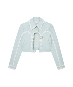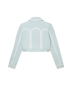 The Cut Out Arch denim jacket is a conceptual take on a classic wardrobe staple incorporating the season’s arch symbol with a cut-out detail at the chest. Crafted from a bleached denim fabric featuring the white cotton broderie anglaise detailing. Finished with the house’s signature gold pearl buttons, buckles and side pockets.