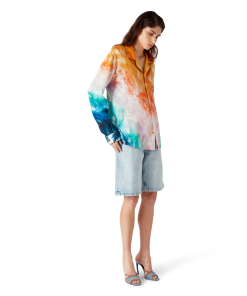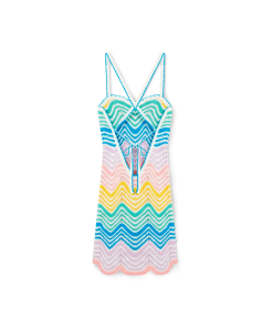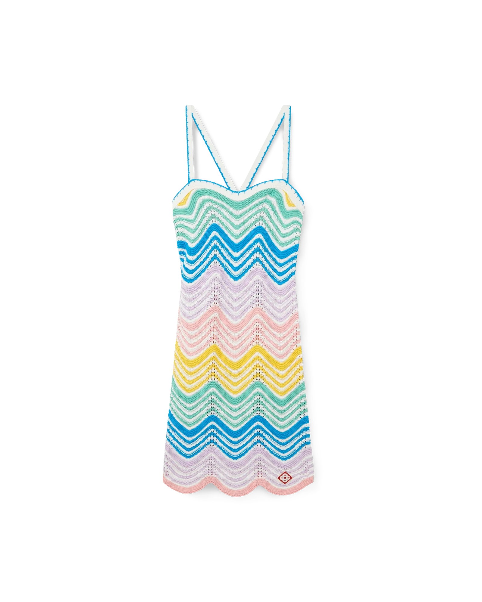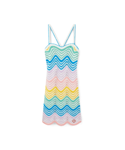 The Gradient Wave crochet dress is a cross-back mini style crafted from a crochet cotton fabric, featuring the house’s wave pattern inspired by the Memphis movement serving as a foundational design element. The colour palette for this collection is light and idealistic, emphasising ethereal themes core to our brand. Completed with the house’s signature diamond logo, and string fastening at the back.